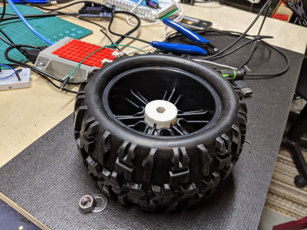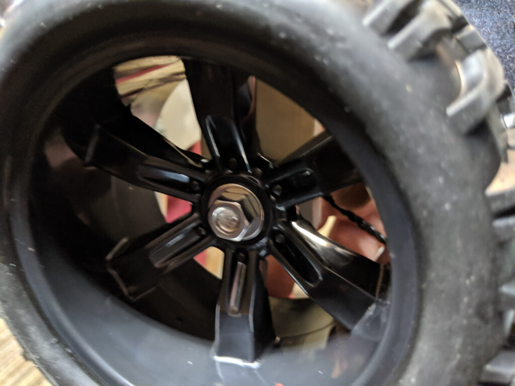 At one point I realized that the wheels were going to be a pain my ass. Not only did they take about 12 hours to print, if they ever broke I had to add another 12 hours just to fix it. So while I did print out one for prosperity I decided to use RC monster truck wheels. Admittedly, this decision was also a pain in my ass because I wanted the wheels to be as close to the original size of 124 mm. Eventually I settled on a style and purchased some 6 inch wheels (150 mm) that were 3.6 inches wide. from China. They took FOREVER to arrive.