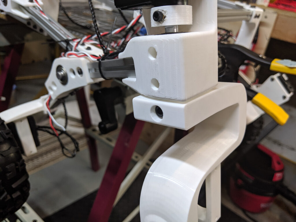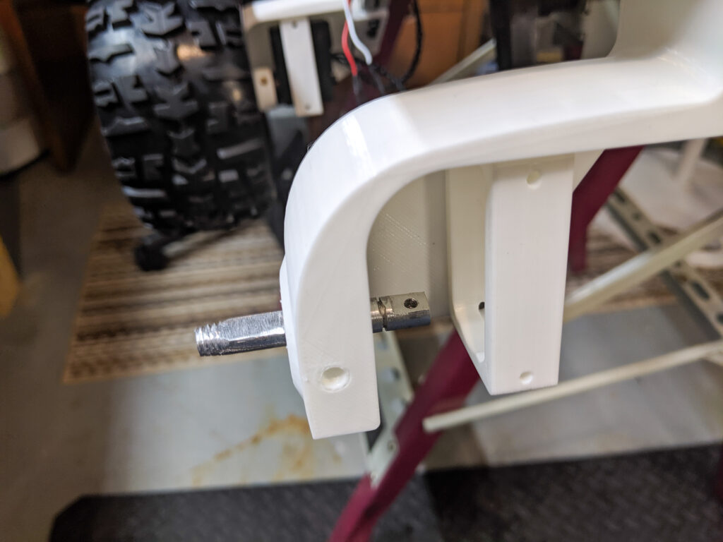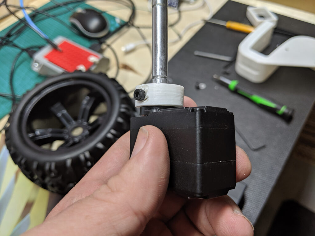 After making sure the servo’s worked (which was preceded by setting up the Raspberry Pi) I set about designing a wheel coupler. After some careful measurements to make sure it would snap onto the inside of the wheel and that the hex nut would fit snugly I printed out some copies to test. Sadly I discovered that the bolt extension of the v1 coupler would crack or snap with too little force so I decided on a pass-through version. Version 2 failed because while I could get enough of the shaft to pass through the hole, I couldn’t get a lock on that rod to keep it from shifting. So version 3 was born with the caveat that I would have to mill a thread onto the shaft. Almost perfection.